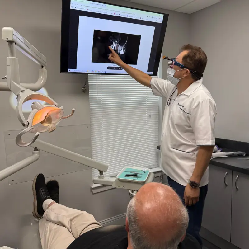 Dr. Aristo Carranza explaining a patient's panoramic dental x-ray on a large screen during a comprehensive consultation at Smile Design NJ.